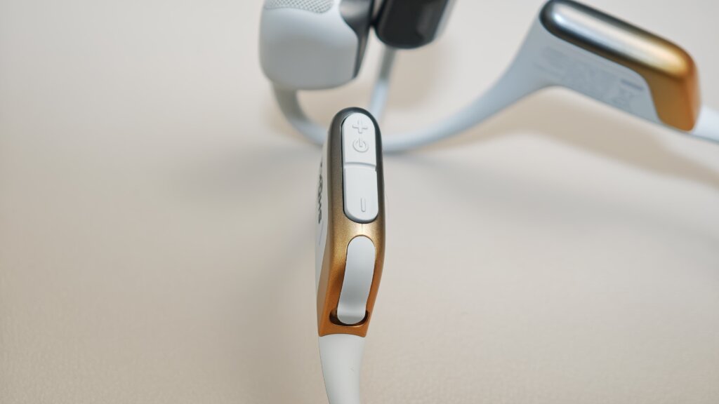 スピーカー部分。OpenRun Pro 2は骨伝導ヘッドホンながら空気伝導のスピーカーも搭載している。